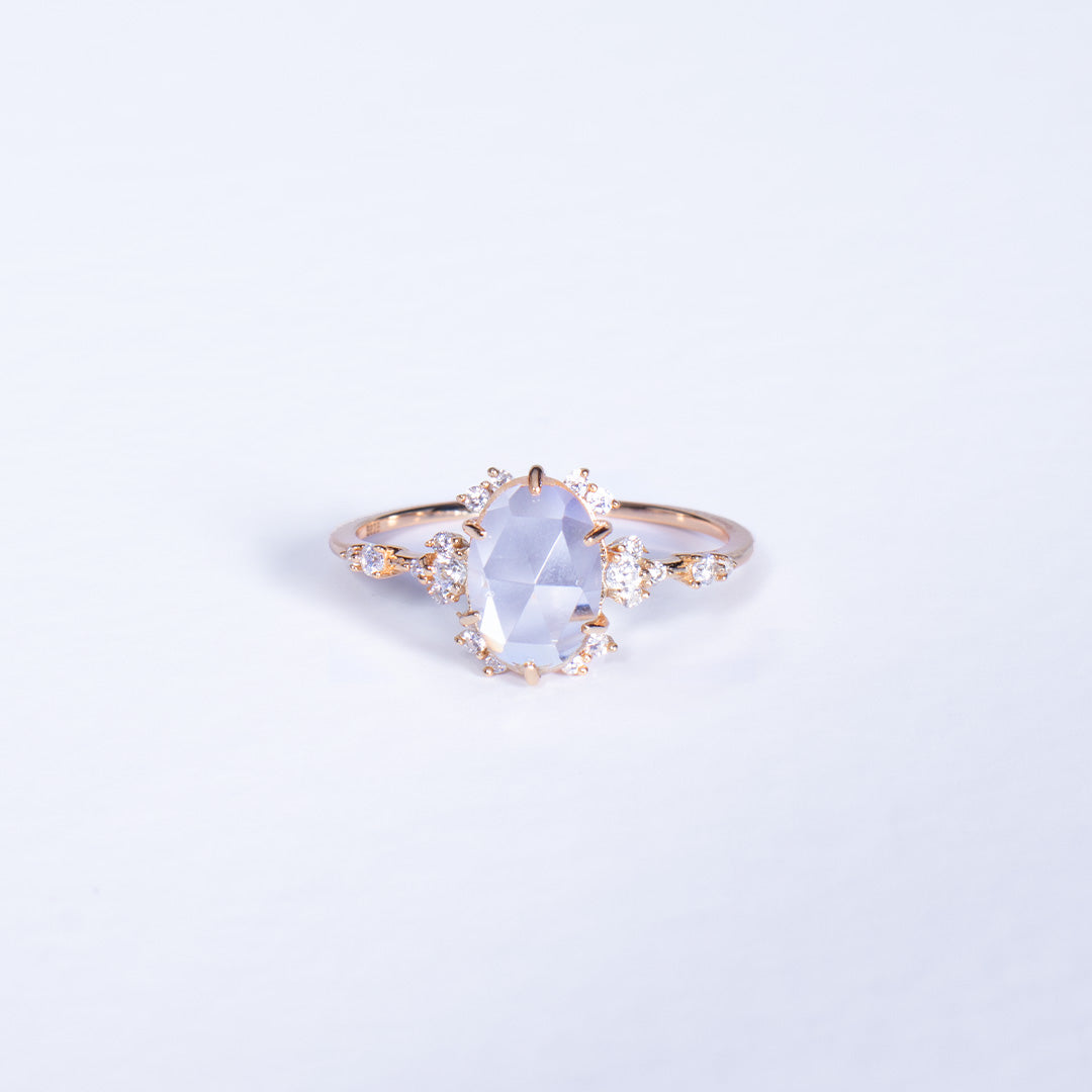 Kjo unazë është një poezi e agimit e bukur, e ndritshme dhe plot dritë e pastër. E punuar me argjend 925 Sterling dhe e veshur me ar 18K, unaza mban një gur kristal të tejdukshëm që reflekton çdo rreze dritë me një shkëlqim hyjnor. Detajet delikate me kristale të vogla anash krijojnë ndjesinë e yjeve që rrethojnë lindjen e diellit, duke sjellë një ndjesi qetësie dhe shprese.