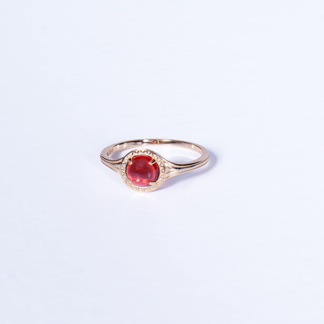 Punuar me argjend 925 Sterling të veshur me ar 18K, kjo unazë mbart në qendër gur natyral karneol simbol i pasionit, krijimtarisë dhe forcës jetësore.