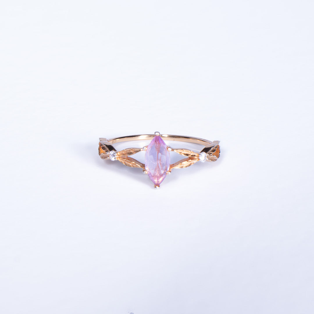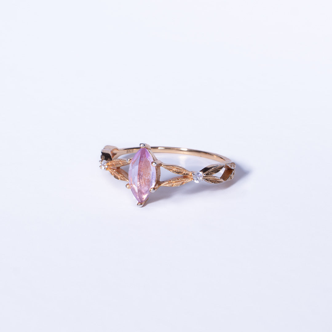 E punuar me argjend 925 Sterling dhe e veshur me ar 18K, unaza shfaq një gur rozë ametist në formë elegante marquise, i rrethuar nga detaje të imta florale që kujtojnë petalet e trëndafilit hyjnor.