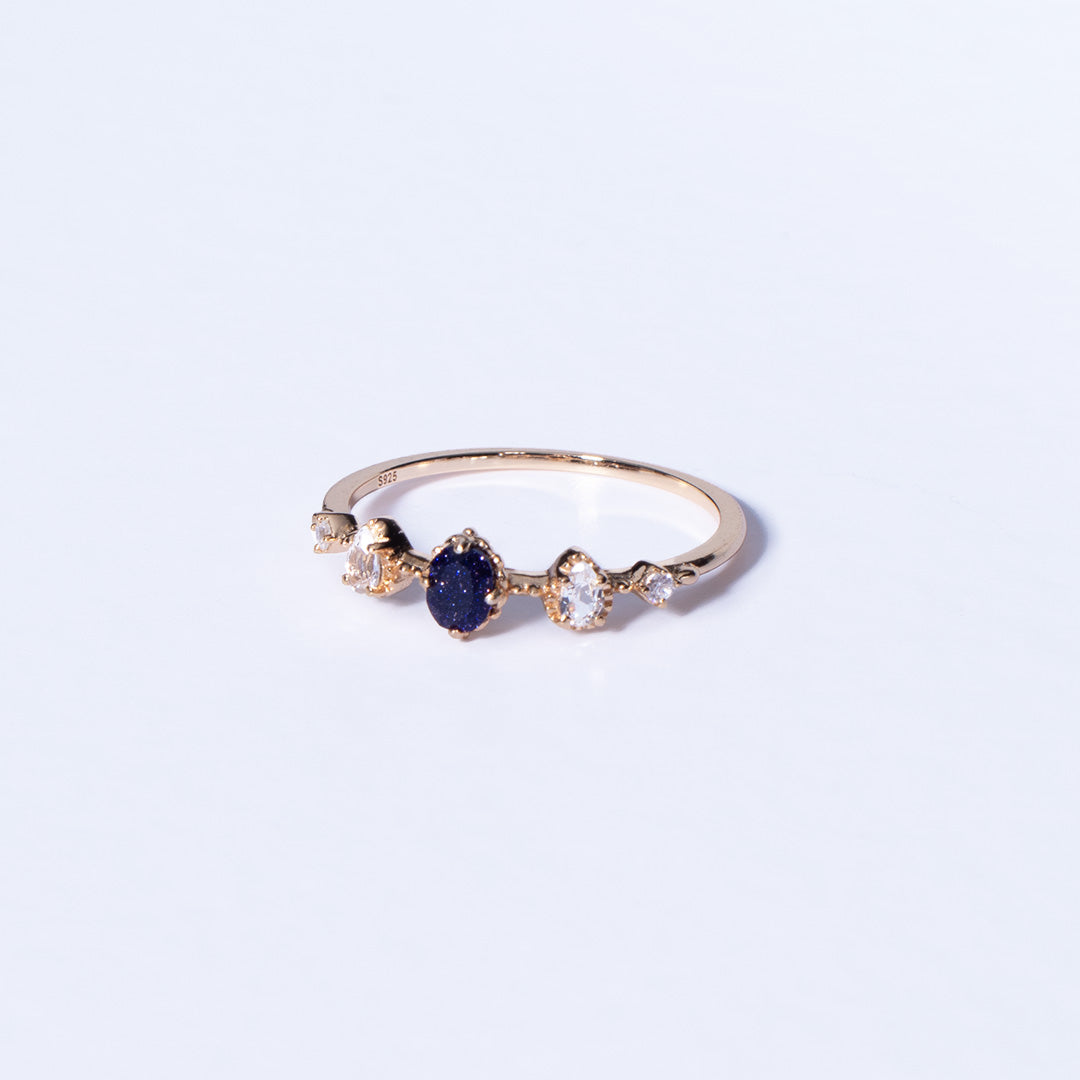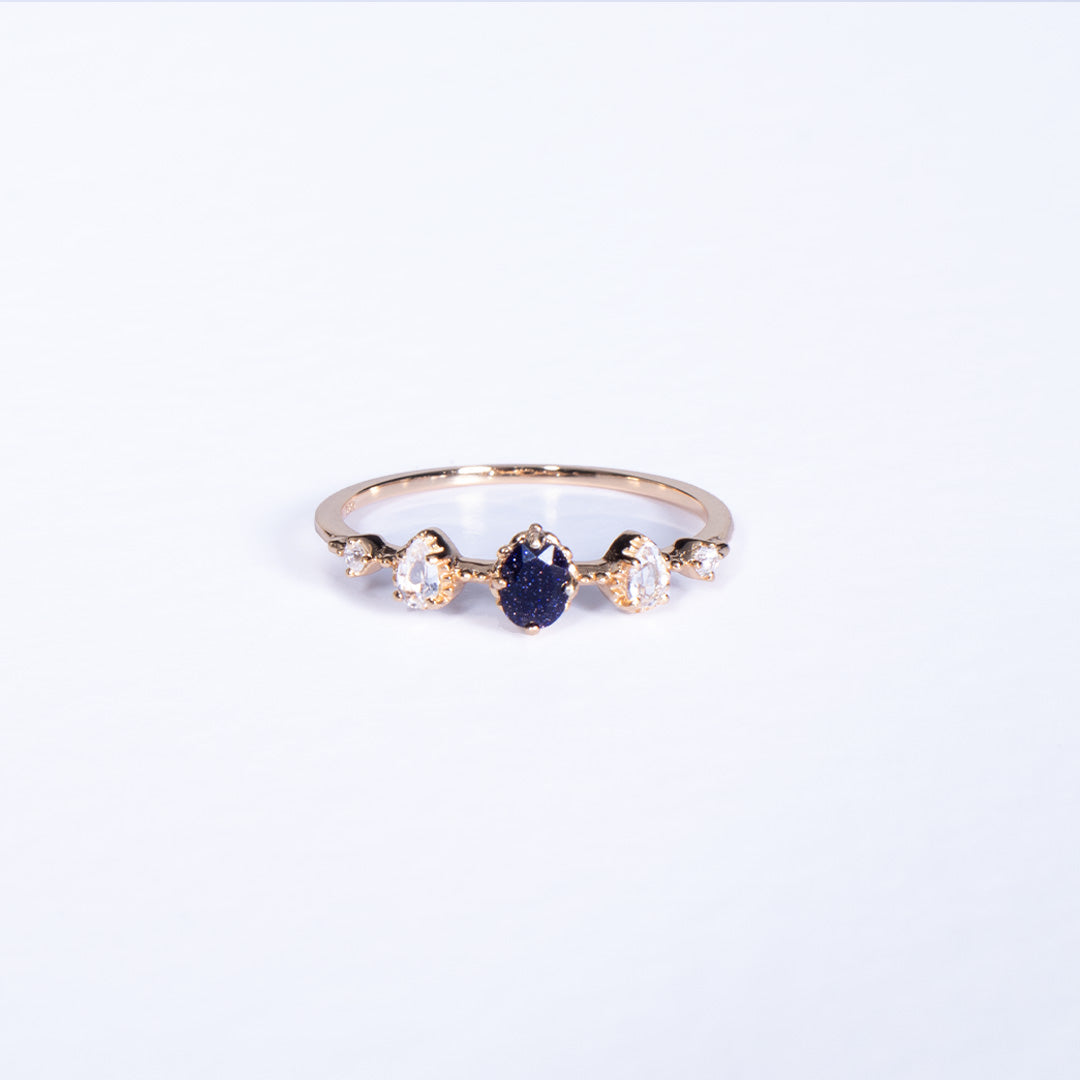 E punuar me argjend 925 Sterling e veshur me ar 18K, kjo unazë përfaqëson qetësinë dhe misterin e qiellit të natës. Guri qendror blue sandstone ndriçon si një galaksi e vogë, çdo grimcë e tij shkëlqen si kujtesë që edhe në errësirë, ekziston dritë.