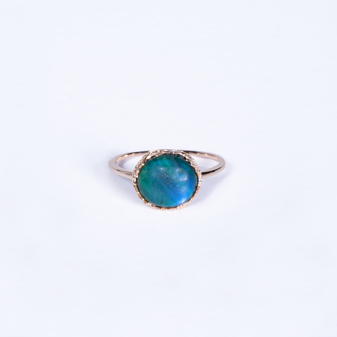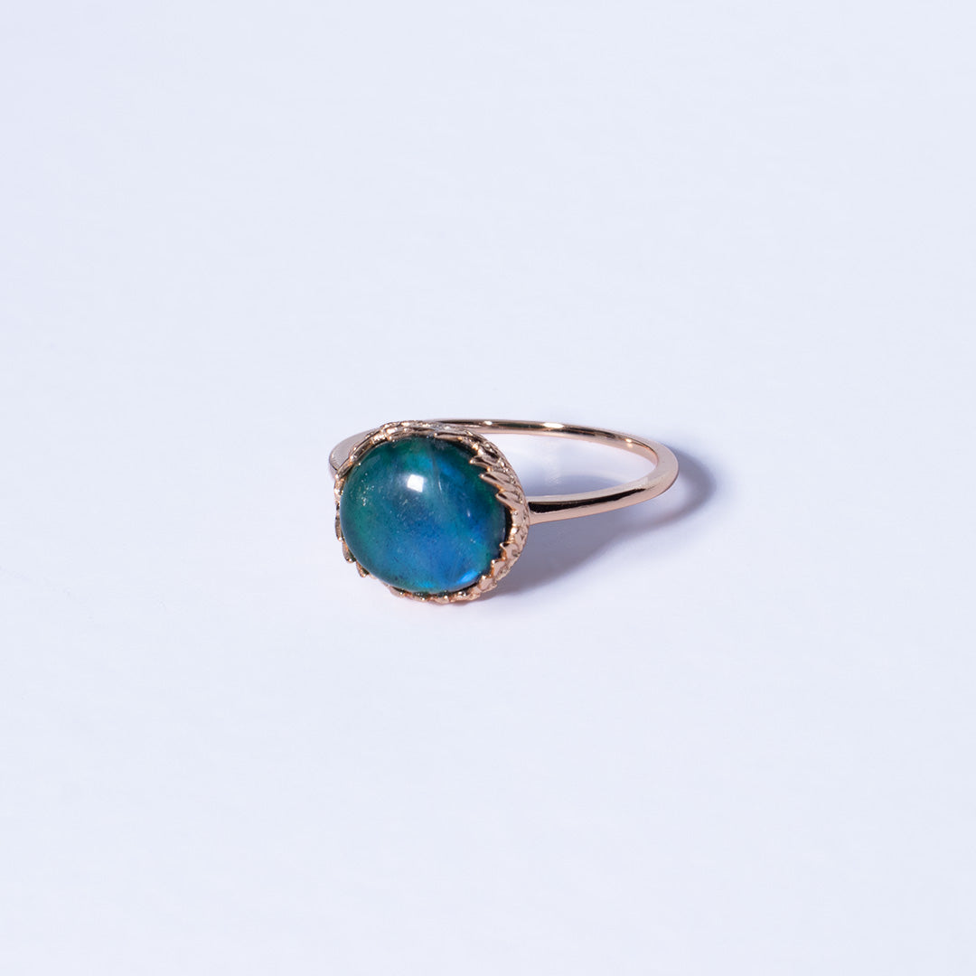 Punuar me argjend 925 Sterling dhe i veshur me ar 18K, kjo unazë përmban një gur natyral labradorit, gur i misterit, transformimit dhe mbrojtjes hyjnore. Nuancat e tij blu-jeshile ndriçojnë si një perde magjike mes dritës dhe hijes, duke zbuluar shkëlqimin e fshehur vetëm kur ndriçohet nga e vërteta.