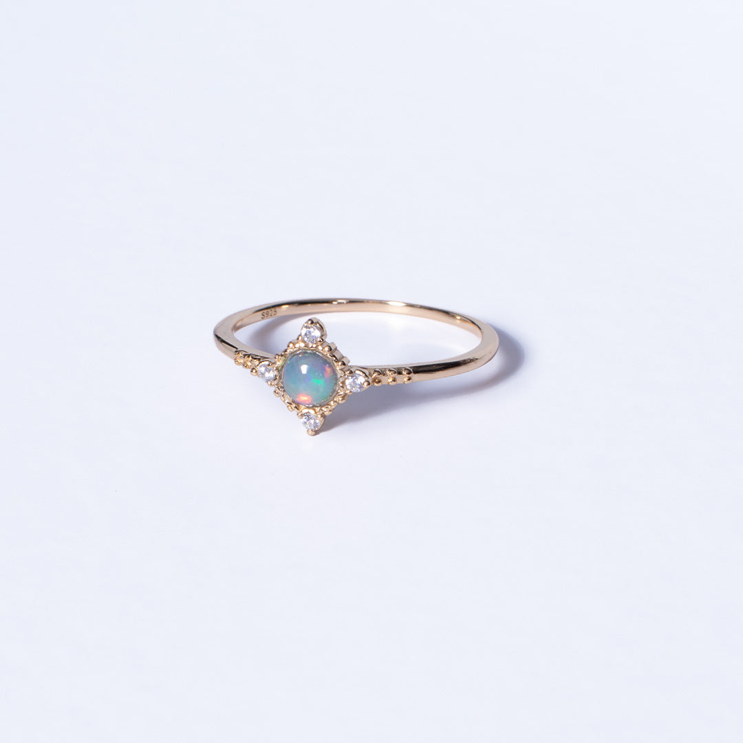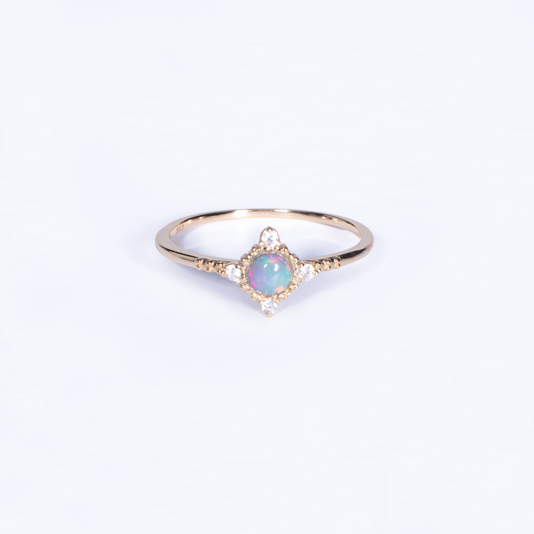 Punuar nga argjend 925 Sterling e veshur me ar 18K, kjo unazë shfaq një opal natyral që ndriçon me reflektime shumëngjyrëshe sikur të mbart brenda një dritë hënore që ndryshon sipas këndit të shpirtit tënd.